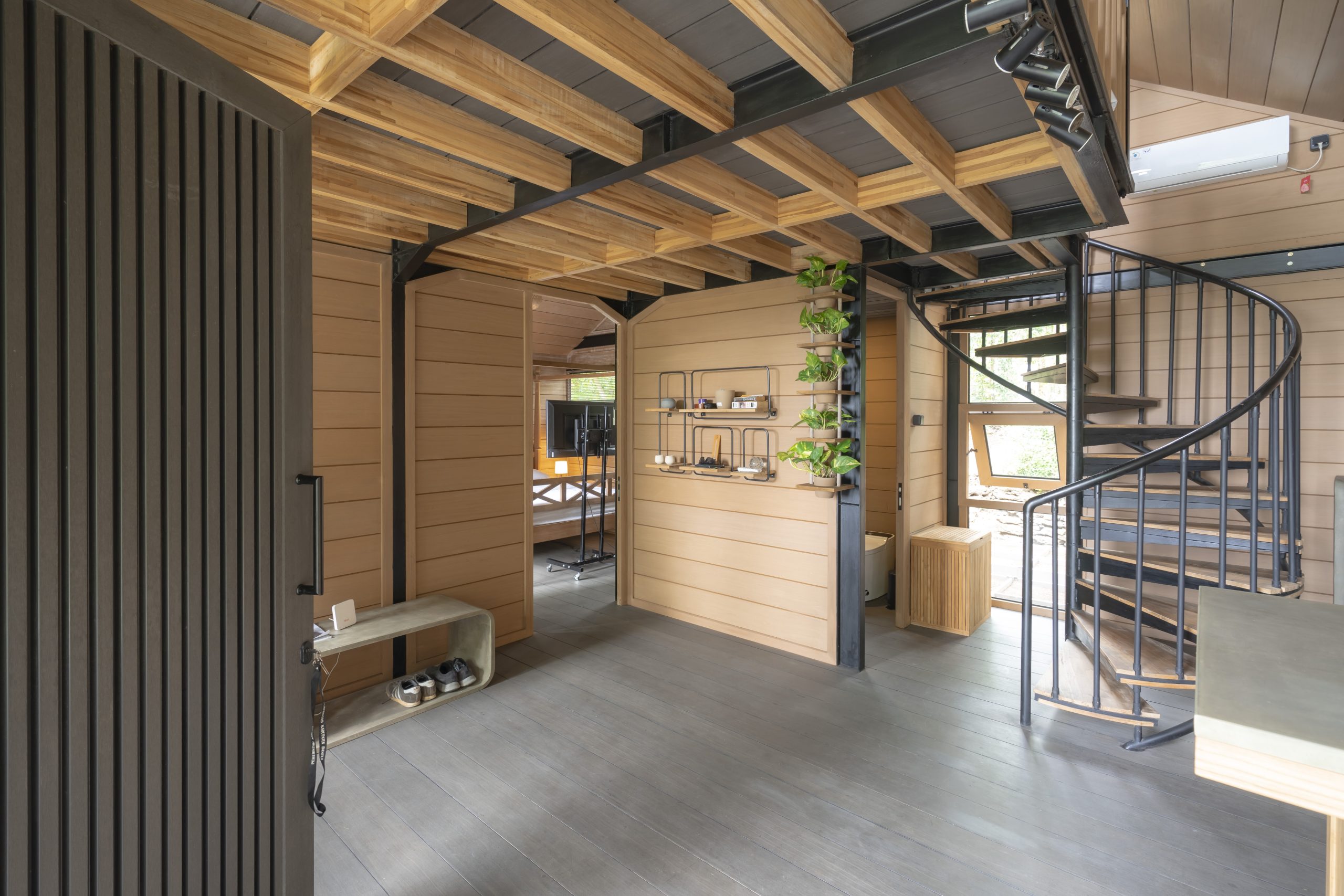 2 pk AC LG, 2 reclaimed teak single beds, 2 small concrete/teak cabinets, LED spots