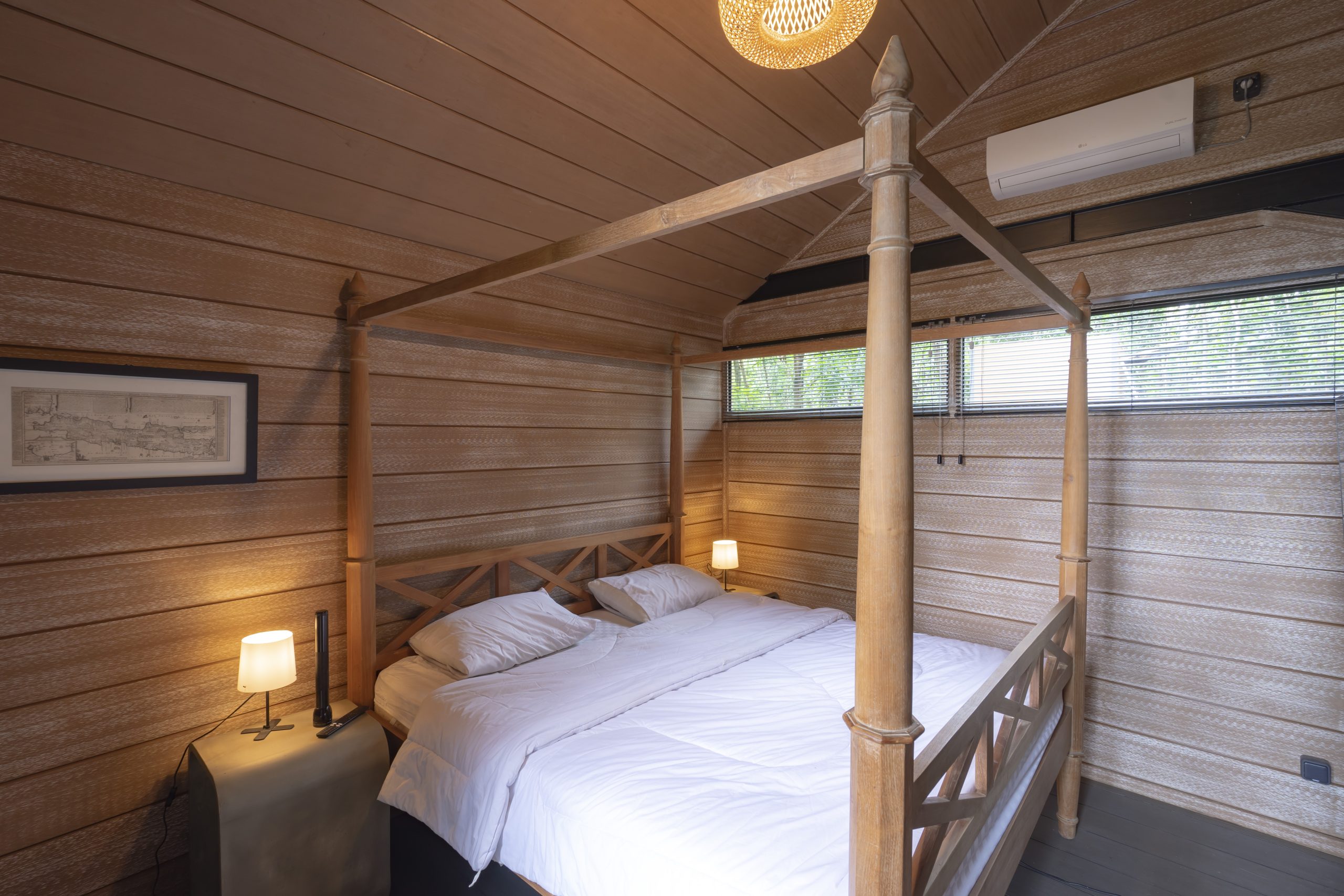 1 pk AC LGreclaimed teak kingsize bed, wicker hanglamp, 2 small bedroom concrete/teak cabinets 2 concrete/teak clothes cabinets